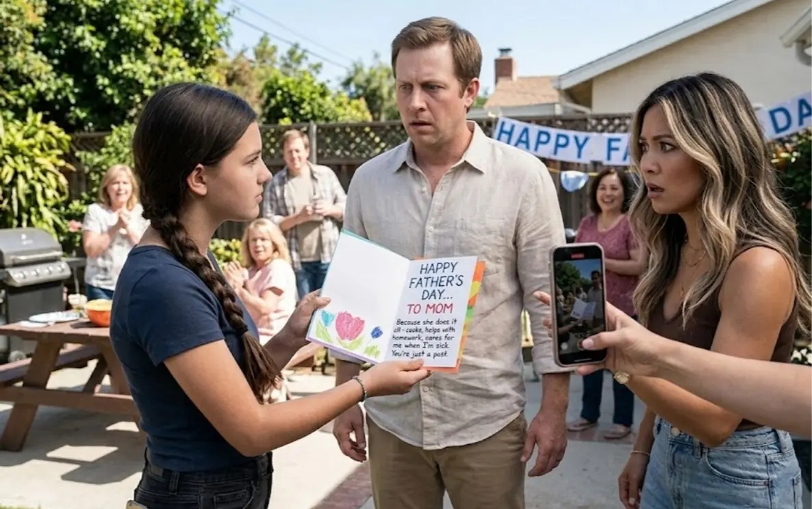 “A Father’s Day card from my daughter,” Kyle said loudly, turning slightly toward Ava’s camera. “Let’s see what she wrote.”